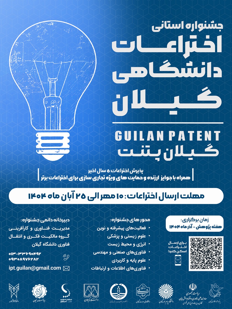 به اطلاع اعضای هیأت علمی، دانشجویان، پژوهشگران و مخترعان گرامی می‌رساند که جشنواره استانی اختراعات دانشگاه گیلان (گیلان پتنت) در هفته پژوهش سال ۱۴۰۴ و در آذرماه برگزار خواهد شد.