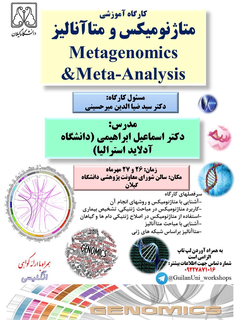 کارگاه آموزشی متاژنومیکس و متآنالیز ، مسئول کارگاه: جناب آقای دکتر سید ضیاء الدین میرحسینی با تدریس جناب آقای دکتر اسماعیل ابراهیمی ( دانشگاه آدلاید استرالیا) در تاریخ 26 و 27 مهرماه 96 در اتاق شورای معاونت پژوهش و فناوری دانشگاه گیلان برگزار می گردد از علاقه مندان دعوت می شود جهت اطلاعات بیشتر با شماره 09227871016 تماس حاصل نمایند