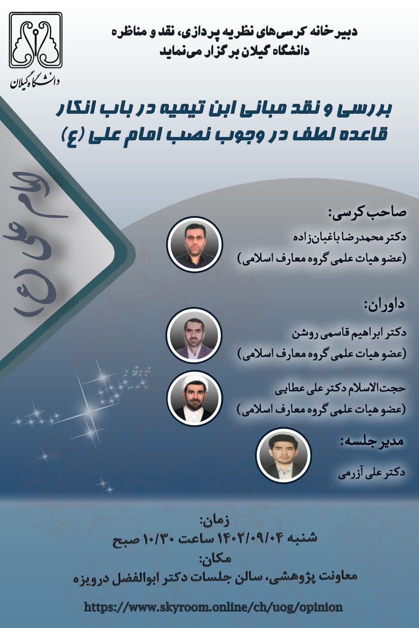 پنجاه و هشتمین کرسی علمی-ترویجی دانشگاه گیلان و ششمین نشست در سال جاری با عنوان « بررسی و نقد مبانی ابن تیمیه در باب انکار قاعده لطف در وجوب نصب امام (ع)» روز شنبه مورخ 1402/09/04 در سالن جلسات معاونت پژوهشی(دکتر ابوالفضل درویزه) برگزار خواهد شد.