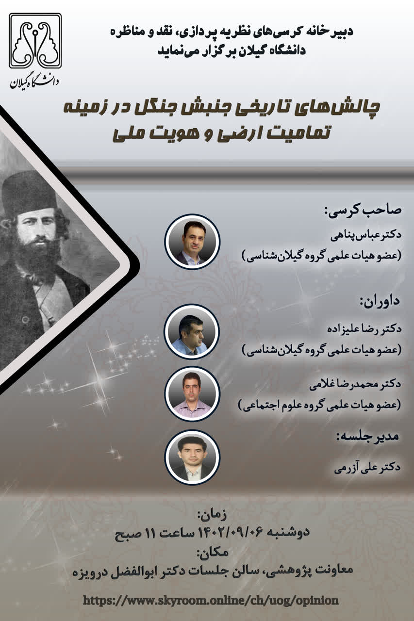 پنجاه و نهمین کرسی علمی-ترویجی دانشگاه گیلان و هفتمین نشست در سال جاری  با عنوان « چالش های تاریخی جنبش جنگل در زمینه تمامیت ارضی و هویت ملی» روز دوشنبه مورخ  1402/09/06 در سالن جلسات معاونت پژوهشی(دکتر ابوالفضل درویزه) برگزار خواهد شد.
