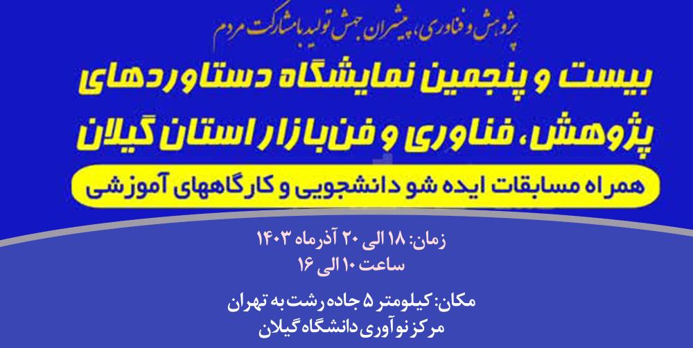 بیست و پنجمین نمایشگاه دستاوردهای پژوهش، فناوری و فن‌بازار استان گیلان با همکاری دستگاه‌های اجرایی استان و به منظور ارائه نیازمندی‌ها و نمایش توانمندی‌های فناوران، دستاوردهای پژوهشی دانشگاه‌ها و مراکز علمی و تحقیقاتی، توسعه زیست بوم فناوری و شناسایی ظرفیت‌های استان در راستای تحقق شعار سال با عنوان «جهش تولید با مشارکت مردم» برگزار می‌شود.