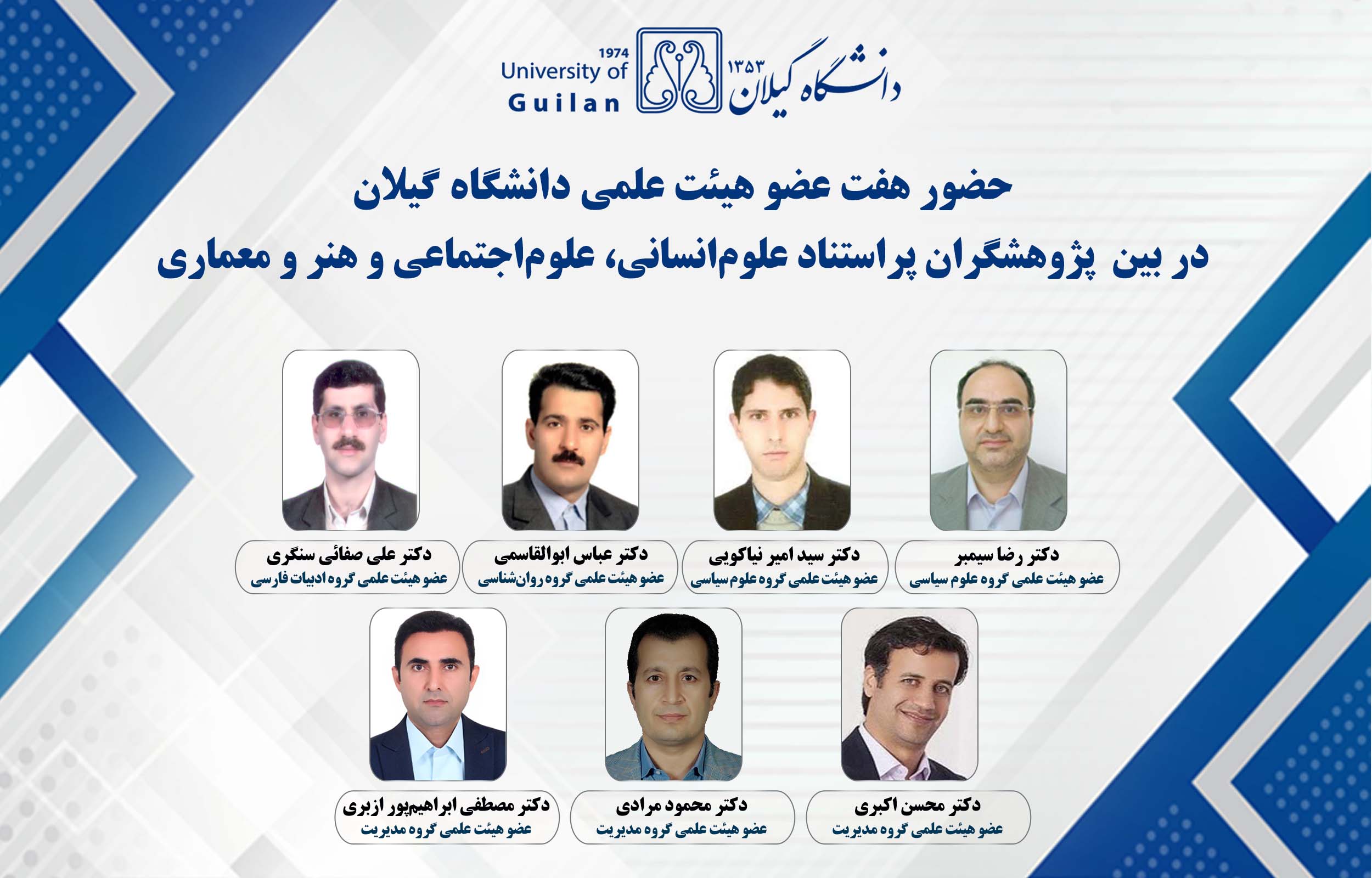 به گزارش معاونت پژوهش و فناوری دانشگاه گیلان و بر اساس اعلام مؤسسه استنادی و پایش علم و فناوری جهان اسلام (ISC)، هفت عضو هیئت علمی دانشگاه گیلان در بین پژوهشگران پراستناد علوم‌انسانی، علوم‌اجتماعی، هنر و معماری قرار گرفتند. بر اساس این گزارش که مؤسسه استنادی و پایش علم و فناوری جهان اسلام (ISC)، به طور سالانه با اتکاء به منابع اطلاعاتی و پایگاه‌های داده خود، پژوهشگران پراستناد در 16 حوزه موضوعی این رشته دربازه زمانی 10 ساله (1402-1393) را منتشر می‌کند؛ دکتر رضا سیمبر و دکتر سید امیر نیاکویی در حوزه موضوعی جامعه شناسی و علوم سیاسی، دکتر عباس ابوالقاسمی در حوزه روان‌شناسی، دکتر علی صفائی سنگری در حوزه زبان و ادبیات فارسی، دکتر محسن اکبری، دکتر محمود مرادی و دکتر مصطفی ابراهیم‌پور ازبری در حوزه کسب و کار، مدیریت و حسابداری، به عنوان پژوهشگران پراستناد علوم‌انسانی، علوم‌اجتماعی، هنر و معماری معرفی شدند. شایان ذکر است معیار انتخاب پژوهشگران در این فهرست، نسبت تعداد استنادهای صورت گرفته به تولیدات علمی این افراد است. روابط عمومی دانشگاه کسب این موفقیت را به پژوهشگران برگزیده و جامعه دانشگاهی تبریک عرض می‌نماید.
