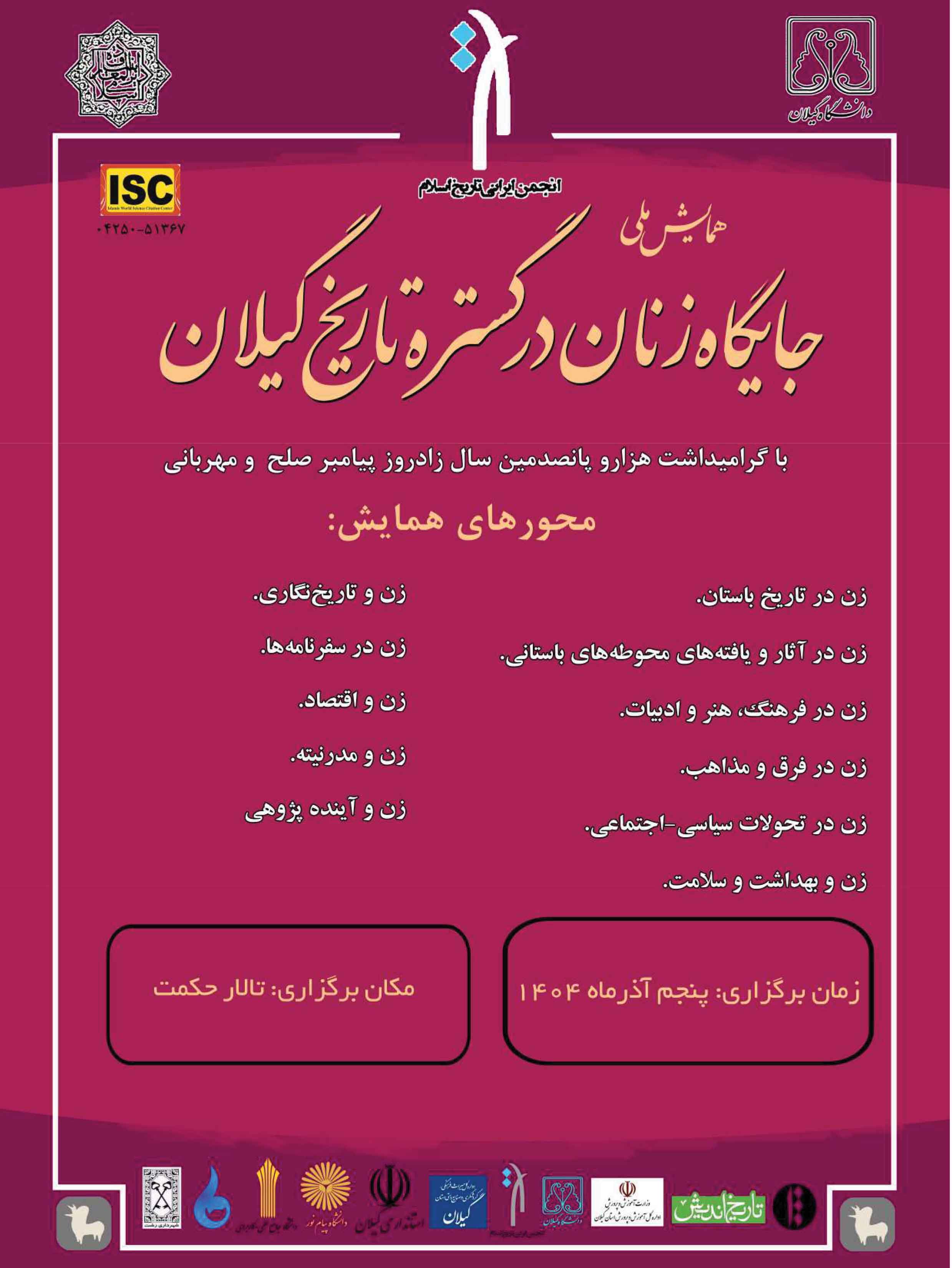 همایش جایگاه زنان در گستره تاریخ گیلان به اهتمام انجمن ایرانی تاریخ اسلام و دانشگاه گیلان، در تاریخ پنجم آذرماه 1404 در دانشگاه گیلان برگزار خواهد شد. این رویداد به دنبال ایجاد زمینه برای تبادل اندیشه، ارتقاء سطح همکاری‌های علمی و فراهم ساختن فرصتی برای ارائه آخرین دستاورهای علمی پژوهشگران در این عرصه است.